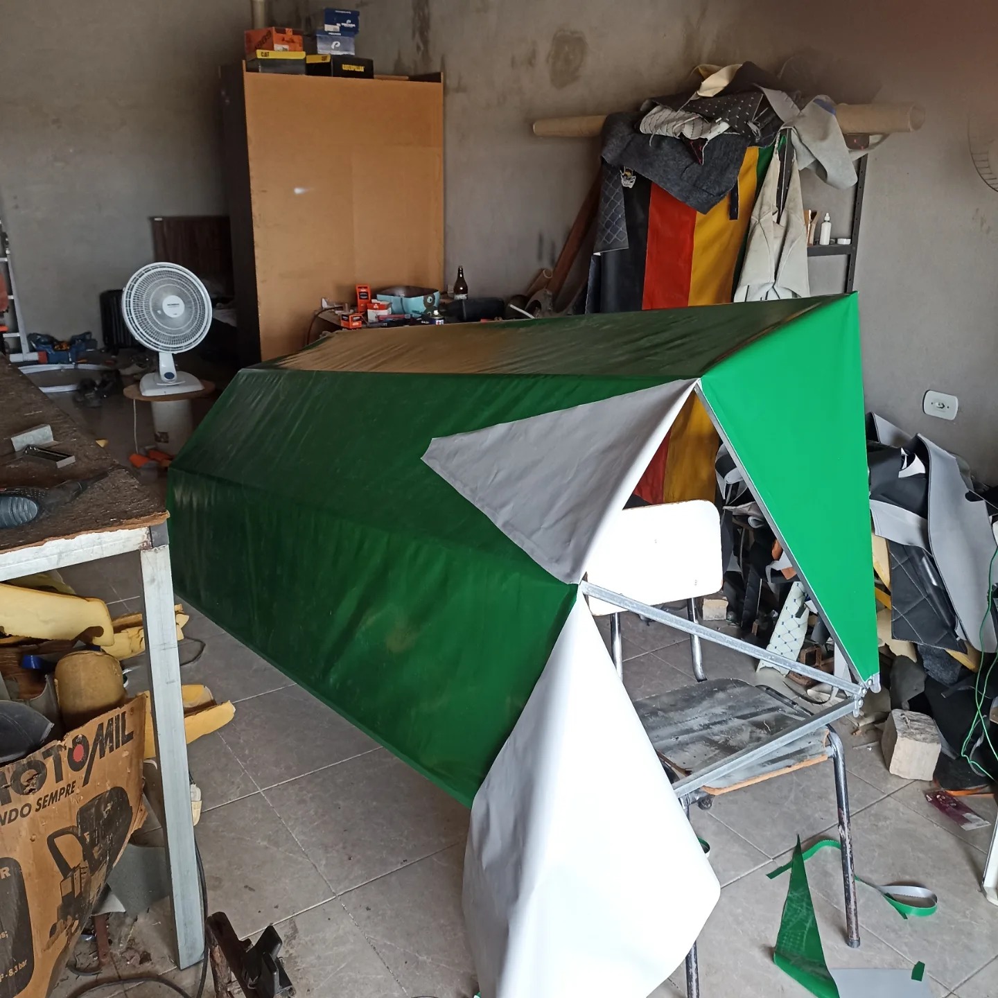 Conheça as soluções personalizadas da d_black_toldos para proteção solar e invólucros. Esta imagem mostra um toldo ou cobertura de lona em processo de fabricação, projetado sob medida com materiais resistentes nas cores verde e branco. Ideal para projetos de arquitetura e design que necessitem de soluções adaptadas a espaços exteriores, terraços, pátios ou áreas comerciais. Oferecemos durabilidade e estética, integrando funcionalidade e estilo em cada design para atender às necessidades específicas do seu projeto, proporcionando sombra e proteção com acabamento profissional.