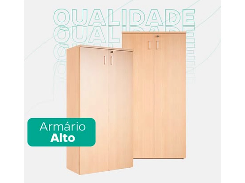 O guarda-roupa da foto tem um design moderno e elegante. É um guarda-roupa alto em madeira clara com acabamento liso e duas portas largas. Cada porta é equipada com uma alça de metal na parte superior, facilitando a abertura. Ele também possui um mecanismo de travamento, o que o torna ideal para manter seus pertences seguros.