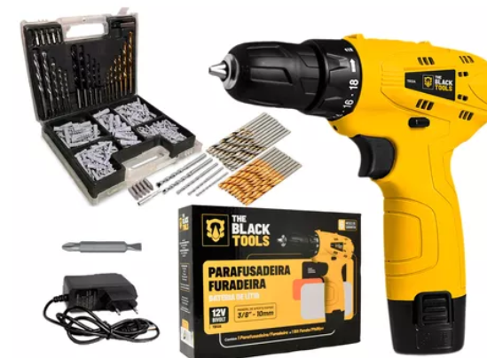 A Parafusadeira/Furadeira The Black Tools TB-12A tem design ergonômico, mandril de 3/8" e luz de LED para iluminação, ideal para alcançar cantos menores e com pouca luz.