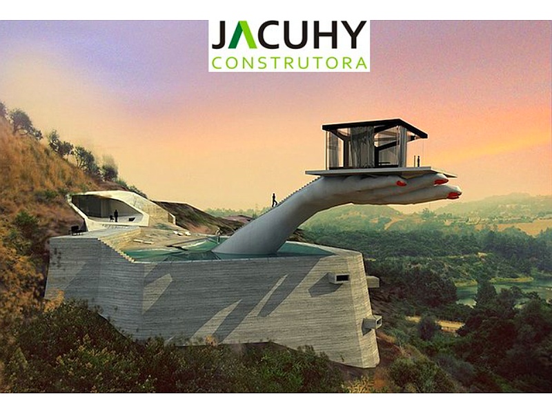 Uma casa de vidro, sustentada (aparentemente) pela mão de uma mulher, construída sobre uma enorme plataforma de concreto.