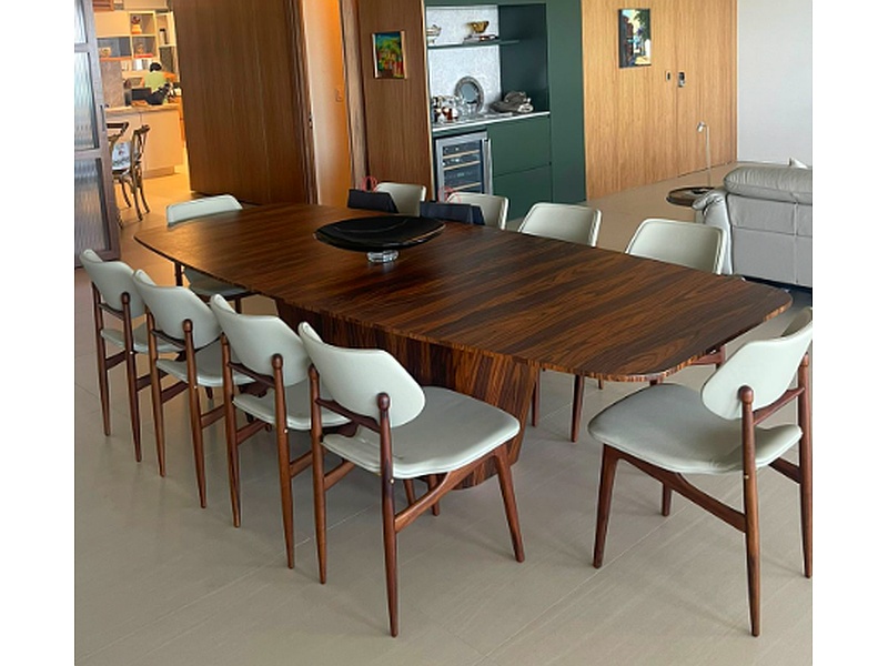 Ele consiste em uma mesa retangular com tampo branco e pernas de madeira clara. Ela é acompanhada por seis cadeiras estofadas bege, que combinam perfeitamente com a mesa. As cadeiras têm um encosto com um design recortado na parte superior, o que dá um toque contemporâneo.