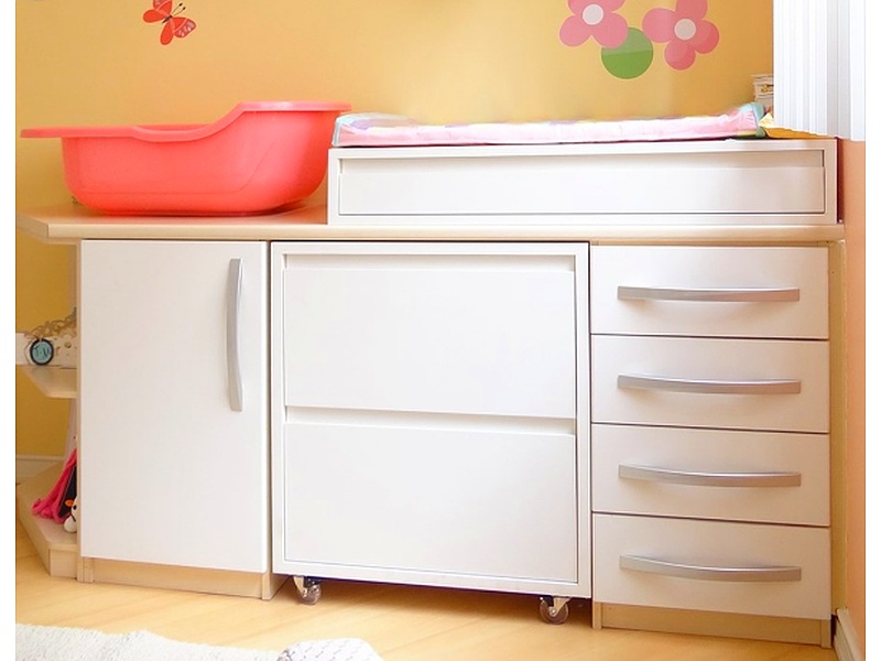 Cômoda para bebê, um móvel prático e seguro para armazenar roupas, fraldas e acessórios do bebê, geralmente com gavetas e prateleiras adaptadas para facilitar o acesso e a organização.