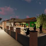 Esta imagem apresenta uma visualização arquitetônica detalhada de um projeto de espaço comercial, desenvolvido pela play arquitetura. A proposta de design integra harmoniosamente áreas interiores e exteriores, criando um ambiente acolhedor e funcional, ideal para estabelecimentos hoteleiros, bares ou restaurantes. Esse tipo de renderização permite que arquitetos, incorporadores e empresários visualizem o resultado final de seus projetos antes da construção, facilitando decisões críticas sobre layout espacial, seleção de materiais, iluminação e mobiliário. É uma ferramenta indispensável para o planeamento e apresentação de projetos de design e construção, garantindo que cada elemento contribui para a estética e operacionalidade do espaço.