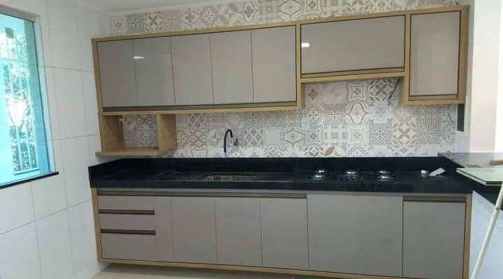A semoveis oferece soluções de mobiliário de cozinha à medida, ideais para arquitetos e designers de interiores que procuram funcionalidade e estética moderna. Este design abrangente apresenta armários superiores e inferiores em tons neutros com acabamentos elegantes e molduras em madeira clara, combinados com bancada escura e backsplash decorativo com padrões geométricos. A fabricação sob medida garante uma adaptação perfeita a qualquer espaço, otimizando a ergonomia e armazenamento para projetos residenciais e comerciais, garantindo um ambiente sofisticado e altamente funcional.